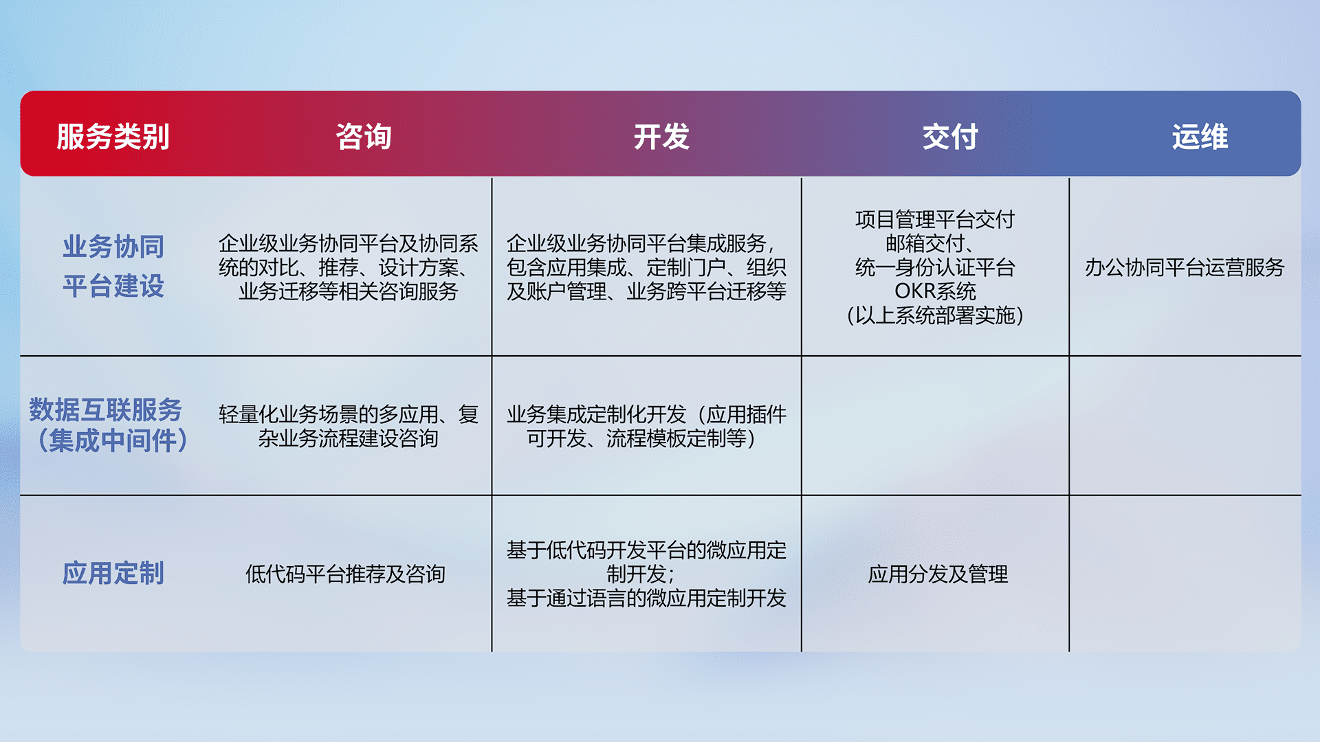 针对钉钉、、企微、、、、IDaas等平台级产品提供产品的规划、、方案、、交付、、、定制化开发等服务,,,,实现如统一协同办公、、、、智能客户服务、、、混合会议管理、、智能数据查询、、、、等业务场景,,实现数字化转型。。