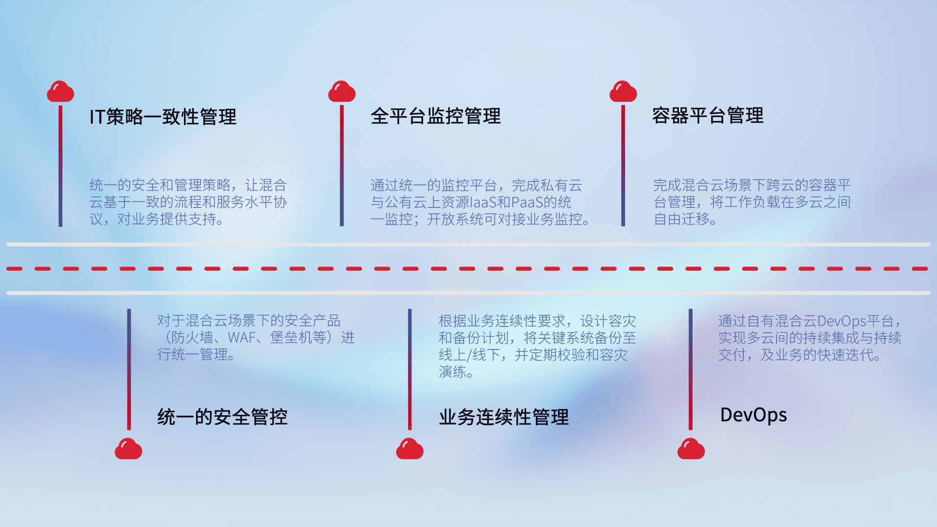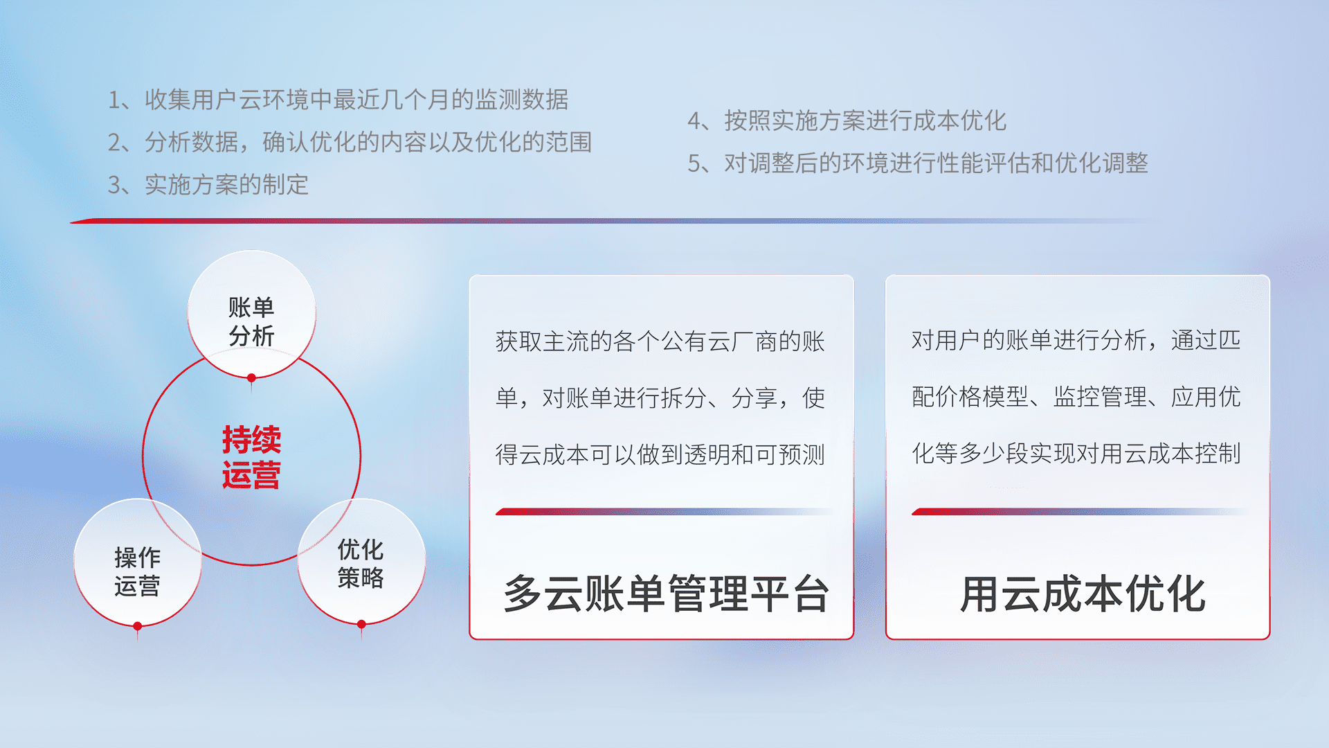 通过多云纳管,,,,以统一的资源数据模型把客户的云资源进行抽象和封装,,进而实现对多云资源的统一操作,,,,保障云资源管理的可靠性、、稳定性与可用性。。。量身定制化运维内容,,配置、、开发运维、、补丁管理、、备份、、监控、、、、认证和访问管理、、、审计和日常巡检等,,保障在用云过程中的可靠度,,稳定度以及高可用率。。。。